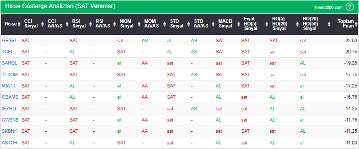 Bu çalışmada “SAT” sinyali veren hisselerin tespiti amacıyla Borsa’da işlem gören BIST 100 hisseler değerlendirmeye alınmıştır. BIST 100 üzerinde teknik analizde kullanılan 12 gösterge yöntemi ile değerleme yapılarak puanlamaya gidilerek hisseler sıralanmıştır. Ancak hisse seçiminde teknik göstergelerin tek başına kullanılması yeterli değildir. Burada ön plana çıkan hisselerin temel analizle desteklemesi ve hisseyle ilgili son haber ve bilgilerin de değerlendirilerek işlemde bulunması, daha sağlıklı sonuçlar için yararlı olacaktır.