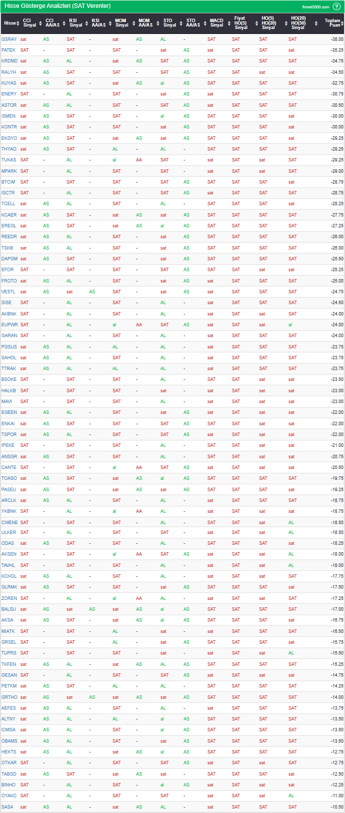 Bu çalışmada “SAT” sinyali veren hisselerin tespiti amacıyla Borsa’da işlem gören BIST 100 hisseler değerlendirmeye alınmıştır. BIST 100 üzerinde teknik analizde kullanılan 12 gösterge yöntemi ile değerleme yapılarak puanlamaya gidilerek hisseler sıralanmıştır. Ancak hisse seçiminde teknik göstergelerin tek başına kullanılması yeterli değildir. Burada ön plana çıkan hisselerin temel analizle desteklemesi ve hisseyle ilgili son haber ve bilgilerin de değerlendirilerek işlemde bulunması, daha sağlıklı sonuçlar için yararlı olacaktır.