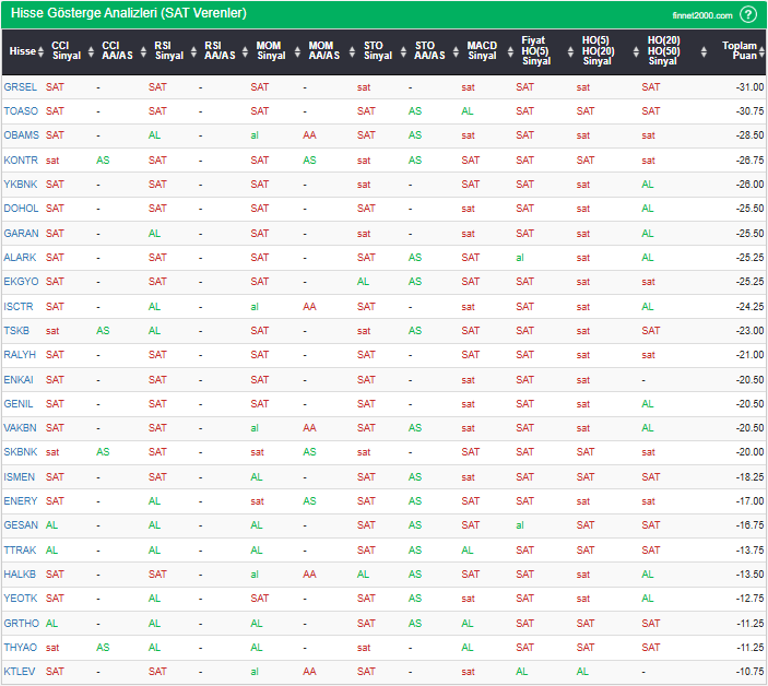 Bu çalışmada “SAT” sinyali veren hisselerin tespiti amacıyla Borsa’da işlem gören BIST 100 hisseler değerlendirmeye alınmıştır. BIST 100 üzerinde teknik analizde kullanılan 12 gösterge yöntemi ile değerleme yapılarak puanlamaya gidilerek hisseler sıralanmıştır. Ancak hisse seçiminde teknik göstergelerin tek başına kullanılması yeterli değildir. Burada ön plana çıkan hisselerin temel analizle desteklemesi ve hisseyle ilgili son haber ve bilgilerin de değerlendirilerek işlemde bulunması, daha sağlıklı sonuçlar için yararlı olacaktır.