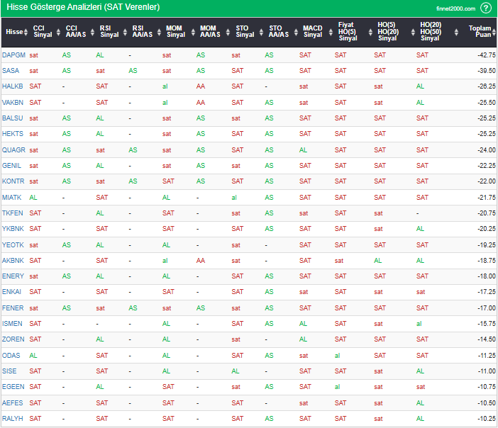 Bu çalışmada “SAT” sinyali veren hisselerin tespiti amacıyla Borsa’da işlem gören BIST 100 hisseler değerlendirmeye alınmıştır. BIST 100 üzerinde teknik analizde kullanılan 12 gösterge yöntemi ile değerleme yapılarak puanlamaya gidilerek hisseler sıralanmıştır. Ancak hisse seçiminde teknik göstergelerin tek başına kullanılması yeterli değildir. Burada ön plana çıkan hisselerin temel analizle desteklemesi ve hisseyle ilgili son haber ve bilgilerin de değerlendirilerek işlemde bulunması, daha sağlıklı sonuçlar için yararlı olacaktır.