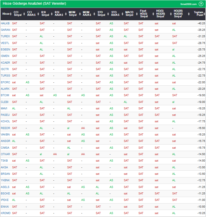 Bu çalışmada “SAT” sinyali veren hisselerin tespiti amacıyla Borsa’da işlem gören BIST 100 hisseler değerlendirmeye alınmıştır. BIST 100 üzerinde teknik analizde kullanılan 12 gösterge yöntemi ile değerleme yapılarak puanlamaya gidilerek hisseler sıralanmıştır. Ancak hisse seçiminde teknik göstergelerin tek başına kullanılması yeterli değildir. Burada ön plana çıkan hisselerin temel analizle desteklemesi ve hisseyle ilgili son haber ve bilgilerin de değerlendirilerek işlemde bulunması, daha sağlıklı sonuçlar için yararlı olacaktır.