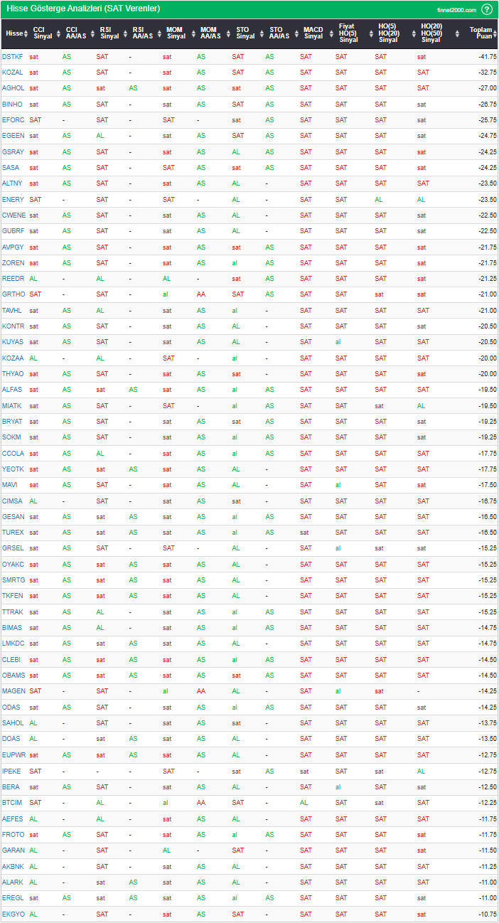 Bu çalışmada “SAT” sinyali veren hisselerin tespiti amacıyla Borsa’da işlem gören BIST 100 hisseler değerlendirmeye alınmıştır. BIST 100 üzerinde teknik analizde kullanılan 12 gösterge yöntemi ile değerleme yapılarak puanlamaya gidilerek hisseler sıralanmıştır. Ancak hisse seçiminde teknik göstergelerin tek başına kullanılması yeterli değildir. Burada ön plana çıkan hisselerin temel analizle desteklemesi ve hisseyle ilgili son haber ve bilgilerin de değerlendirilerek işlemde bulunması, daha sağlıklı sonuçlar için yararlı olacaktır.