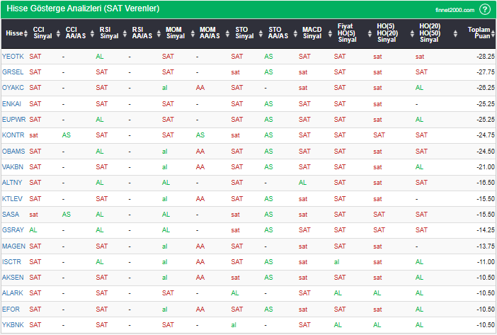 Bu çalışmada “SAT” sinyali veren hisselerin tespiti amacıyla Borsa’da işlem gören BIST 100 hisseler değerlendirmeye alınmıştır. BIST 100 üzerinde teknik analizde kullanılan 12 gösterge yöntemi ile değerleme yapılarak puanlamaya gidilerek hisseler sıralanmıştır. Ancak hisse seçiminde teknik göstergelerin tek başına kullanılması yeterli değildir. Burada ön plana çıkan hisselerin temel analizle desteklemesi ve hisseyle ilgili son haber ve bilgilerin de değerlendirilerek işlemde bulunması, daha sağlıklı sonuçlar için yararlı olacaktır.