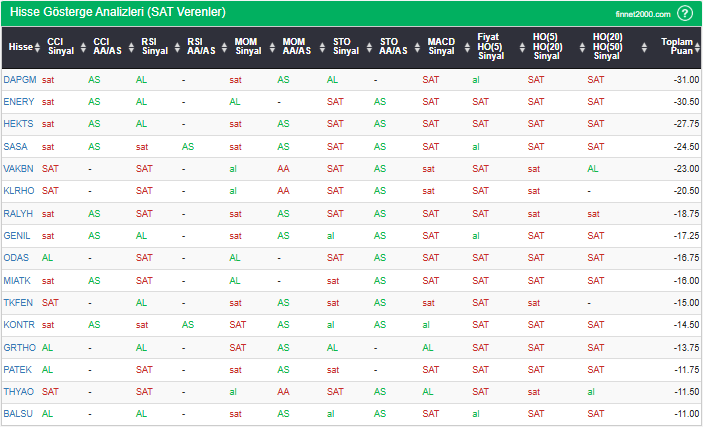 Bu çalışmada “SAT” sinyali veren hisselerin tespiti amacıyla Borsa’da işlem gören BIST 100 hisseler değerlendirmeye alınmıştır. BIST 100 üzerinde teknik analizde kullanılan 12 gösterge yöntemi ile değerleme yapılarak puanlamaya gidilerek hisseler sıralanmıştır. Ancak hisse seçiminde teknik göstergelerin tek başına kullanılması yeterli değildir. Burada ön plana çıkan hisselerin temel analizle desteklemesi ve hisseyle ilgili son haber ve bilgilerin de değerlendirilerek işlemde bulunması, daha sağlıklı sonuçlar için yararlı olacaktır.