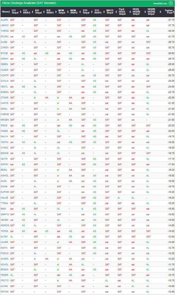 Bu çalışmada “SAT” sinyali veren hisselerin tespiti amacıyla Borsa’da işlem gören BIST 100 hisseler değerlendirmeye alınmıştır. BIST 100 üzerinde teknik analizde kullanılan 12 gösterge yöntemi ile değerleme yapılarak puanlamaya gidilerek hisseler sıralanmıştır. Ancak hisse seçiminde teknik göstergelerin tek başına kullanılması yeterli değildir. Burada ön plana çıkan hisselerin temel analizle desteklemesi ve hisseyle ilgili son haber ve bilgilerin de değerlendirilerek işlemde bulunması, daha sağlıklı sonuçlar için yararlı olacaktır.