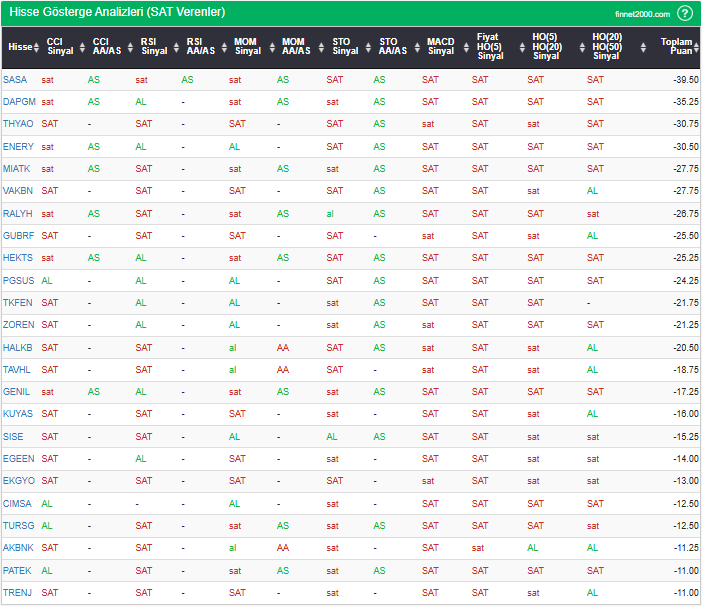 Bu çalışmada “SAT” sinyali veren hisselerin tespiti amacıyla Borsa’da işlem gören BIST 100 hisseler değerlendirmeye alınmıştır. BIST 100 üzerinde teknik analizde kullanılan 12 gösterge yöntemi ile değerleme yapılarak puanlamaya gidilerek hisseler sıralanmıştır. Ancak hisse seçiminde teknik göstergelerin tek başına kullanılması yeterli değildir. Burada ön plana çıkan hisselerin temel analizle desteklemesi ve hisseyle ilgili son haber ve bilgilerin de değerlendirilerek işlemde bulunması, daha sağlıklı sonuçlar için yararlı olacaktır.
