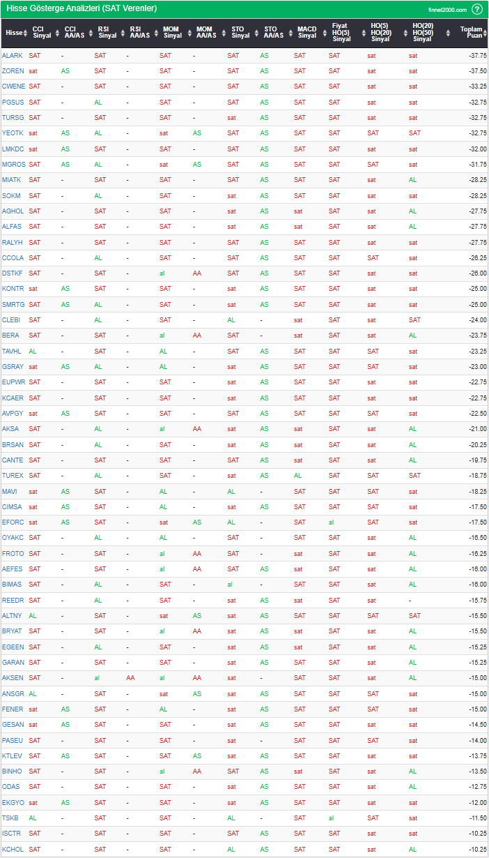 Bu çalışmada “SAT” sinyali veren hisselerin tespiti amacıyla Borsa’da işlem gören BIST 100 hisseler değerlendirmeye alınmıştır. BIST 100 üzerinde teknik analizde kullanılan 12 gösterge yöntemi ile değerleme yapılarak puanlamaya gidilerek hisseler sıralanmıştır. Ancak hisse seçiminde teknik göstergelerin tek başına kullanılması yeterli değildir. Burada ön plana çıkan hisselerin temel analizle desteklemesi ve hisseyle ilgili son haber ve bilgilerin de değerlendirilerek işlemde bulunması, daha sağlıklı sonuçlar için yararlı olacaktır.
