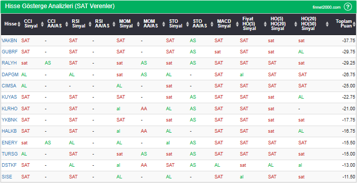 Bu çalışmada “SAT” sinyali veren hisselerin tespiti amacıyla Borsa’da işlem gören BIST 100 hisseler değerlendirmeye alınmıştır. BIST 100 üzerinde teknik analizde kullanılan 12 gösterge yöntemi ile değerleme yapılarak puanlamaya gidilerek hisseler sıralanmıştır. Ancak hisse seçiminde teknik göstergelerin tek başına kullanılması yeterli değildir. Burada ön plana çıkan hisselerin temel analizle desteklemesi ve hisseyle ilgili son haber ve bilgilerin de değerlendirilerek işlemde bulunması, daha sağlıklı sonuçlar için yararlı olacaktır.