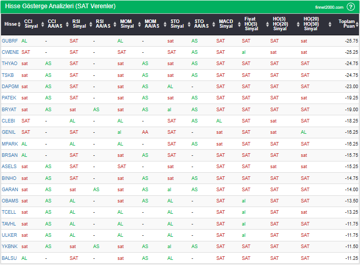 Bu çalışmada “SAT” sinyali veren hisselerin tespiti amacıyla Borsa’da işlem gören BIST 100 hisseler değerlendirmeye alınmıştır. BIST 100 üzerinde teknik analizde kullanılan 12 gösterge yöntemi ile değerleme yapılarak puanlamaya gidilerek hisseler sıralanmıştır. Ancak hisse seçiminde teknik göstergelerin tek başına kullanılması yeterli değildir. Burada ön plana çıkan hisselerin temel analizle desteklemesi ve hisseyle ilgili son haber ve bilgilerin de değerlendirilerek işlemde bulunması, daha sağlıklı sonuçlar için yararlı olacaktır.