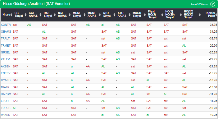 Bu çalışmada “SAT” sinyali veren hisselerin tespiti amacıyla Borsa’da işlem gören BIST 100 hisseler değerlendirmeye alınmıştır. BIST 100 üzerinde teknik analizde kullanılan 12 gösterge yöntemi ile değerleme yapılarak puanlamaya gidilerek hisseler sıralanmıştır. Ancak hisse seçiminde teknik göstergelerin tek başına kullanılması yeterli değildir. Burada ön plana çıkan hisselerin temel analizle desteklemesi ve hisseyle ilgili son haber ve bilgilerin de değerlendirilerek işlemde bulunması, daha sağlıklı sonuçlar için yararlı olacaktır.