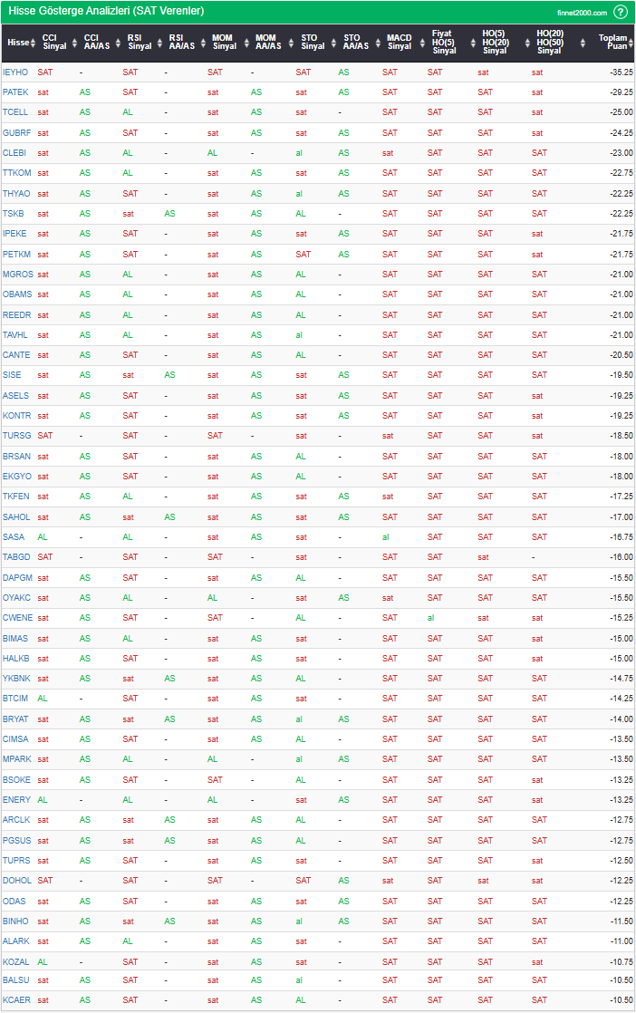 Bu çalışmada “SAT” sinyali veren hisselerin tespiti amacıyla Borsa’da işlem gören BIST 100 hisseler değerlendirmeye alınmıştır. BIST 100 üzerinde teknik analizde kullanılan 12 gösterge yöntemi ile değerleme yapılarak puanlamaya gidilerek hisseler sıralanmıştır. Ancak hisse seçiminde teknik göstergelerin tek başına kullanılması yeterli değildir. Burada ön plana çıkan hisselerin temel analizle desteklemesi ve hisseyle ilgili son haber ve bilgilerin de değerlendirilerek işlemde bulunması, daha sağlıklı sonuçlar için yararlı olacaktır.