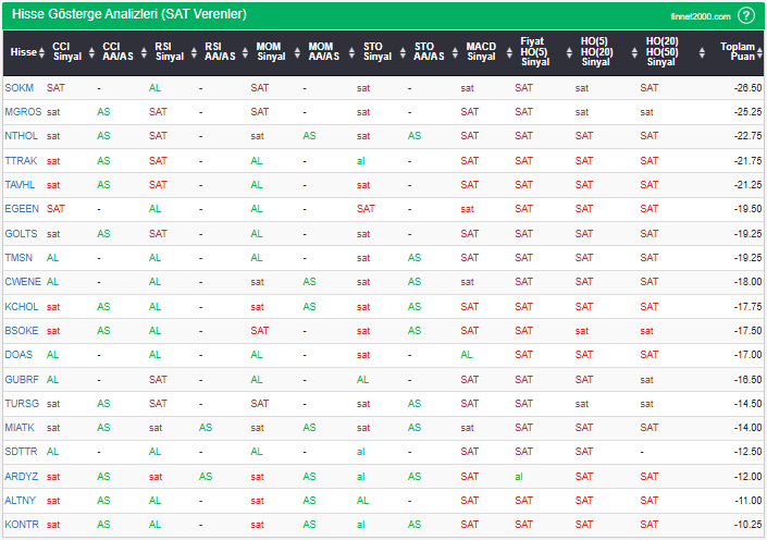 Bu çalışmada “SAT” sinyali veren hisselerin tespiti amacıyla Borsa’da işlem gören BIST 100 hisseler değerlendirmeye alınmıştır. BIST 100 üzerinde teknik analizde kullanılan 12 gösterge yöntemi ile değerleme yapılarak puanlamaya gidilerek hisseler sıralanmıştır. Ancak hisse seçiminde teknik göstergelerin tek başına kullanılması yeterli değildir. Burada ön plana çıkan hisselerin temel analizle desteklemesi ve hisseyle ilgili son haber ve bilgilerin de değerlendirilerek işlemde bulunması, daha sağlıklı sonuçlar için yararlı olacaktır.
