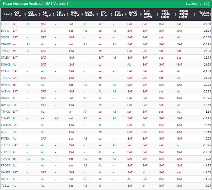 Bu çalışmada “SAT” sinyali veren hisselerin tespiti amacıyla Borsa’da işlem gören BIST 100 hisseler değerlendirmeye alınmıştır. BIST 100 üzerinde teknik analizde kullanılan 12 gösterge yöntemi ile değerleme yapılarak puanlamaya gidilerek hisseler sıralanmıştır. Ancak hisse seçiminde teknik göstergelerin tek başına kullanılması yeterli değildir. Burada ön plana çıkan hisselerin temel analizle desteklemesi ve hisseyle ilgili son haber ve bilgilerin de değerlendirilerek işlemde bulunması, daha sağlıklı sonuçlar için yararlı olacaktır.