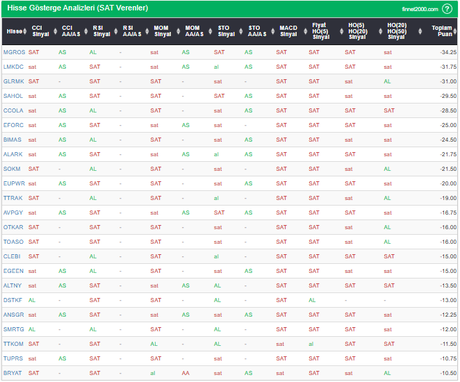 Bu çalışmada “SAT” sinyali veren hisselerin tespiti amacıyla Borsa’da işlem gören BIST 100 hisseler değerlendirmeye alınmıştır. BIST 100 üzerinde teknik analizde kullanılan 12 gösterge yöntemi ile değerleme yapılarak puanlamaya gidilerek hisseler sıralanmıştır. Ancak hisse seçiminde teknik göstergelerin tek başına kullanılması yeterli değildir. Burada ön plana çıkan hisselerin temel analizle desteklemesi ve hisseyle ilgili son haber ve bilgilerin de değerlendirilerek işlemde bulunması, daha sağlıklı sonuçlar için yararlı olacaktır.