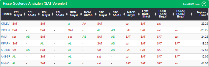 Bu çalışmada “SAT” sinyali veren hisselerin tespiti amacıyla Borsa’da işlem gören BIST 100 hisseler değerlendirmeye alınmıştır. BIST 100 üzerinde teknik analizde kullanılan 12 gösterge yöntemi ile değerleme yapılarak puanlamaya gidilerek hisseler sıralanmıştır. Ancak hisse seçiminde teknik göstergelerin tek başına kullanılması yeterli değildir. Burada ön plana çıkan hisselerin temel analizle desteklemesi ve hisseyle ilgili son haber ve bilgilerin de değerlendirilerek işlemde bulunması, daha sağlıklı sonuçlar için yararlı olacaktır.