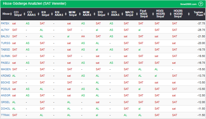 Bu çalışmada “SAT” sinyali veren hisselerin tespiti amacıyla Borsa’da işlem gören BIST 100 hisseler değerlendirmeye alınmıştır. BIST 100 üzerinde teknik analizde kullanılan 12 gösterge yöntemi ile değerleme yapılarak puanlamaya gidilerek hisseler sıralanmıştır. Ancak hisse seçiminde teknik göstergelerin tek başına kullanılması yeterli değildir. Burada ön plana çıkan hisselerin temel analizle desteklemesi ve hisseyle ilgili son haber ve bilgilerin de değerlendirilerek işlemde bulunması, daha sağlıklı sonuçlar için yararlı olacaktır.