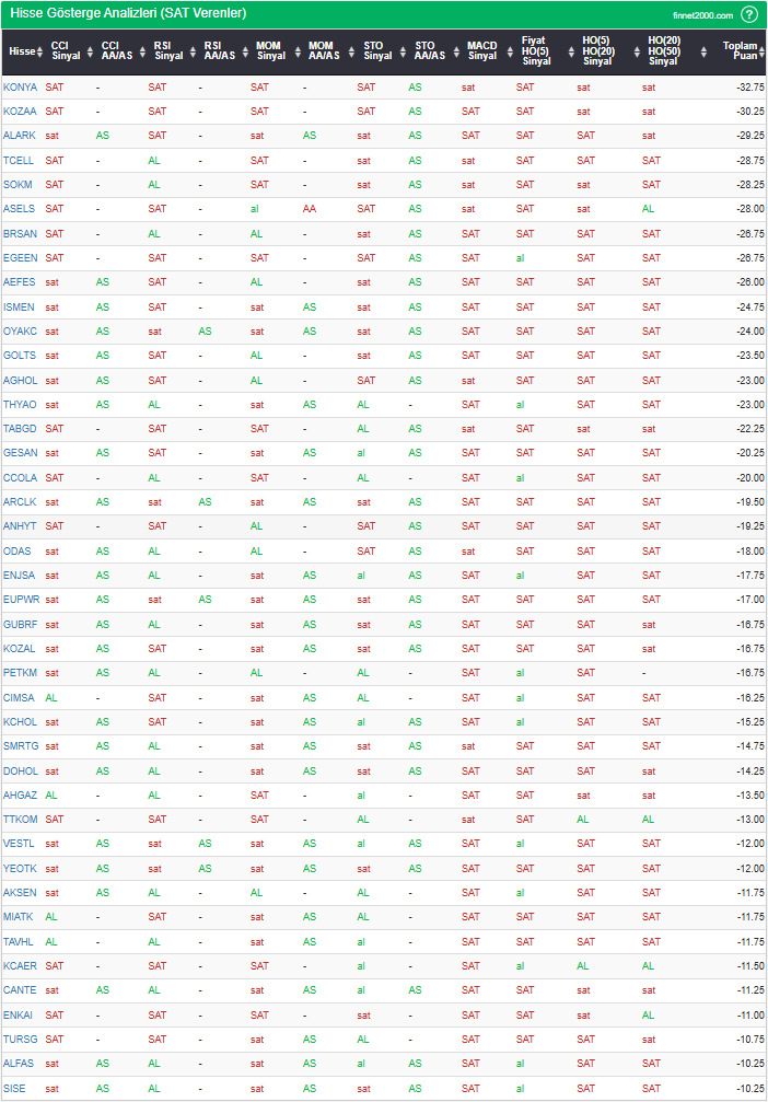Bu çalışmada “SAT” sinyali veren hisselerin tespiti amacıyla Borsa’da işlem gören BIST 100 hisseler değerlendirmeye alınmıştır. BIST 100 üzerinde teknik analizde kullanılan 12 gösterge yöntemi ile değerleme yapılarak puanlamaya gidilerek hisseler sıralanmıştır. Ancak hisse seçiminde teknik göstergelerin tek başına kullanılması yeterli değildir. Burada ön plana çıkan hisselerin temel analizle desteklemesi ve hisseyle ilgili son haber ve bilgilerin de değerlendirilerek işlemde bulunması, daha sağlıklı sonuçlar için yararlı olacaktır.