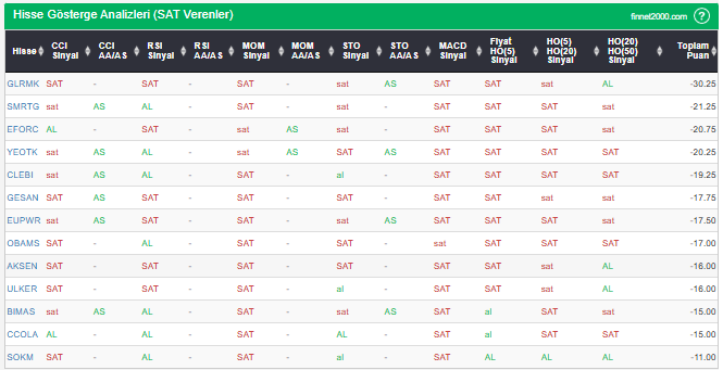 Bu çalışmada “SAT” sinyali veren hisselerin tespiti amacıyla Borsa’da işlem gören BIST 100 hisseler değerlendirmeye alınmıştır. BIST 100 üzerinde teknik analizde kullanılan 12 gösterge yöntemi ile değerleme yapılarak puanlamaya gidilerek hisseler sıralanmıştır. Ancak hisse seçiminde teknik göstergelerin tek başına kullanılması yeterli değildir. Burada ön plana çıkan hisselerin temel analizle desteklemesi ve hisseyle ilgili son haber ve bilgilerin de değerlendirilerek işlemde bulunması, daha sağlıklı sonuçlar için yararlı olacaktır.
