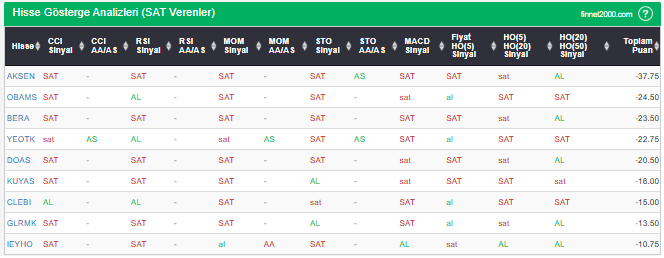 Bu çalışmada “SAT” sinyali veren hisselerin tespiti amacıyla Borsa’da işlem gören BIST 100 hisseler değerlendirmeye alınmıştır. BIST 100 üzerinde teknik analizde kullanılan 12 gösterge yöntemi ile değerleme yapılarak puanlamaya gidilerek hisseler sıralanmıştır. Ancak hisse seçiminde teknik göstergelerin tek başına kullanılması yeterli değildir. Burada ön plana çıkan hisselerin temel analizle desteklemesi ve hisseyle ilgili son haber ve bilgilerin de değerlendirilerek işlemde bulunması, daha sağlıklı sonuçlar için yararlı olacaktır.
