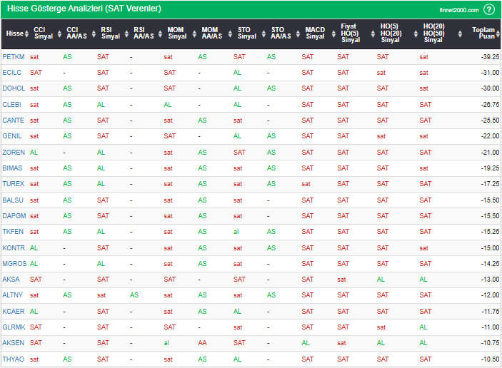 Bu çalışmada “SAT” sinyali veren hisselerin tespiti amacıyla Borsa’da işlem gören BIST 100 hisseler değerlendirmeye alınmıştır. BIST 100 üzerinde teknik analizde kullanılan 12 gösterge yöntemi ile değerleme yapılarak puanlamaya gidilerek hisseler sıralanmıştır. Ancak hisse seçiminde teknik göstergelerin tek başına kullanılması yeterli değildir. Burada ön plana çıkan hisselerin temel analizle desteklemesi ve hisseyle ilgili son haber ve bilgilerin de değerlendirilerek işlemde bulunması, daha sağlıklı sonuçlar için yararlı olacaktır.