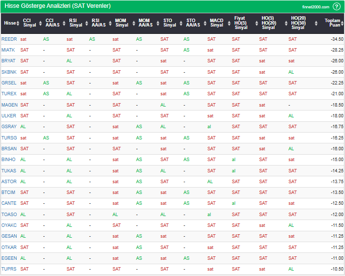 Bu çalışmada “SAT” sinyali veren hisselerin tespiti amacıyla Borsa’da işlem gören BIST 100 hisseler değerlendirmeye alınmıştır. BIST 100 üzerinde teknik analizde kullanılan 12 gösterge yöntemi ile değerleme yapılarak puanlamaya gidilerek hisseler sıralanmıştır. Ancak hisse seçiminde teknik göstergelerin tek başına kullanılması yeterli değildir. Burada ön plana çıkan hisselerin temel analizle desteklemesi ve hisseyle ilgili son haber ve bilgilerin de değerlendirilerek işlemde bulunması, daha sağlıklı sonuçlar için yararlı olacaktır.
