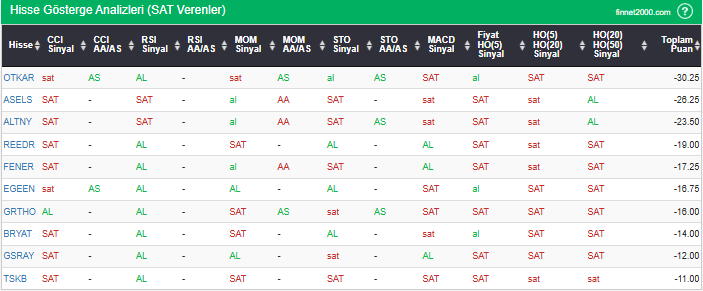 Bu çalışmada “SAT” sinyali veren hisselerin tespiti amacıyla Borsa’da işlem gören BIST 100 hisseler değerlendirmeye alınmıştır. BIST 100 üzerinde teknik analizde kullanılan 12 gösterge yöntemi ile değerleme yapılarak puanlamaya gidilerek hisseler sıralanmıştır. Ancak hisse seçiminde teknik göstergelerin tek başına kullanılması yeterli değildir. Burada ön plana çıkan hisselerin temel analizle desteklemesi ve hisseyle ilgili son haber ve bilgilerin de değerlendirilerek işlemde bulunması, daha sağlıklı sonuçlar için yararlı olacaktır.