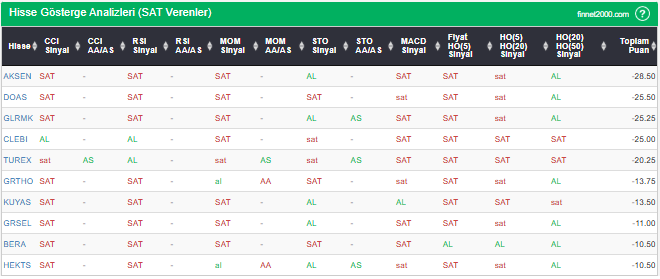 Bu çalışmada “SAT” sinyali veren hisselerin tespiti amacıyla Borsa’da işlem gören BIST 100 hisseler değerlendirmeye alınmıştır. BIST 100 üzerinde teknik analizde kullanılan 12 gösterge yöntemi ile değerleme yapılarak puanlamaya gidilerek hisseler sıralanmıştır. Ancak hisse seçiminde teknik göstergelerin tek başına kullanılması yeterli değildir. Burada ön plana çıkan hisselerin temel analizle desteklemesi ve hisseyle ilgili son haber ve bilgilerin de değerlendirilerek işlemde bulunması, daha sağlıklı sonuçlar için yararlı olacaktır.
