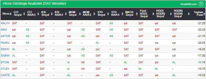 Bu çalışmada “SAT” sinyali veren hisselerin tespiti amacıyla Borsa’da işlem gören BIST 100 hisseler değerlendirmeye alınmıştır. BIST 100 üzerinde teknik analizde kullanılan 12 gösterge yöntemi ile değerleme yapılarak puanlamaya gidilerek hisseler sıralanmıştır. Ancak hisse seçiminde teknik göstergelerin tek başına kullanılması yeterli değildir. Burada ön plana çıkan hisselerin temel analizle desteklemesi ve hisseyle ilgili son haber ve bilgilerin de değerlendirilerek işlemde bulunması, daha sağlıklı sonuçlar için yararlı olacaktır.