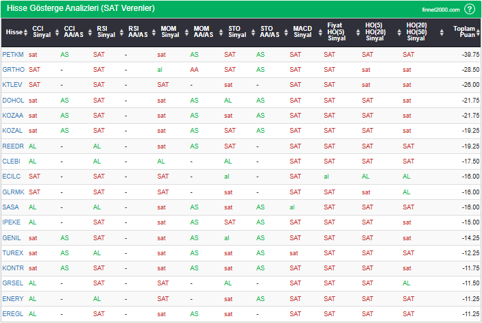 Bu çalışmada “SAT” sinyali veren hisselerin tespiti amacıyla Borsa’da işlem gören BIST 100 hisseler değerlendirmeye alınmıştır. BIST 100 üzerinde teknik analizde kullanılan 12 gösterge yöntemi ile değerleme yapılarak puanlamaya gidilerek hisseler sıralanmıştır. Ancak hisse seçiminde teknik göstergelerin tek başına kullanılması yeterli değildir. Burada ön plana çıkan hisselerin temel analizle desteklemesi ve hisseyle ilgili son haber ve bilgilerin de değerlendirilerek işlemde bulunması, daha sağlıklı sonuçlar için yararlı olacaktır.