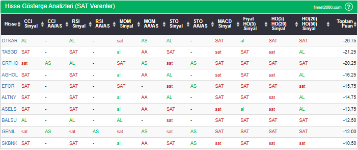 Bu çalışmada “SAT” sinyali veren hisselerin tespiti amacıyla Borsa’da işlem gören BIST 100 hisseler değerlendirmeye alınmıştır. BIST 100 üzerinde teknik analizde kullanılan 12 gösterge yöntemi ile değerleme yapılarak puanlamaya gidilerek hisseler sıralanmıştır. Ancak hisse seçiminde teknik göstergelerin tek başına kullanılması yeterli değildir. Burada ön plana çıkan hisselerin temel analizle desteklemesi ve hisseyle ilgili son haber ve bilgilerin de değerlendirilerek işlemde bulunması, daha sağlıklı sonuçlar için yararlı olacaktır.