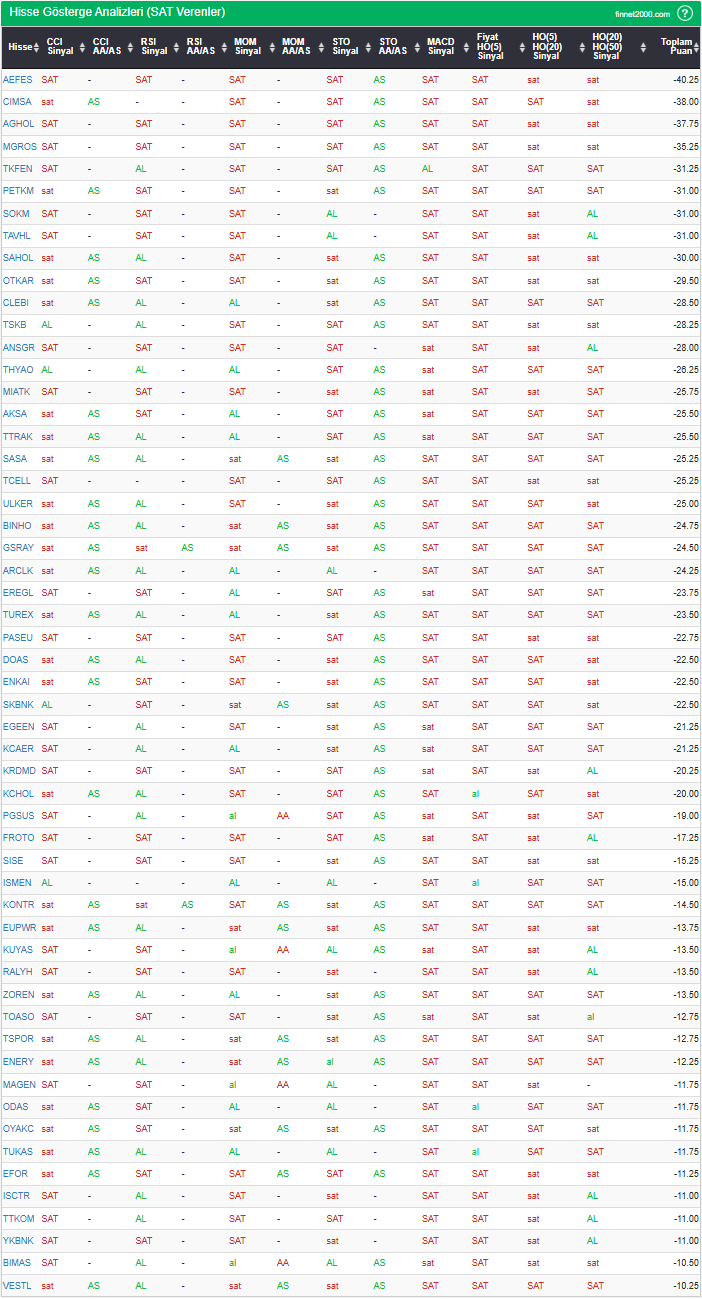 Bu çalışmada “SAT” sinyali veren hisselerin tespiti amacıyla Borsa’da işlem gören BIST 100 hisseler değerlendirmeye alınmıştır. BIST 100 üzerinde teknik analizde kullanılan 12 gösterge yöntemi ile değerleme yapılarak puanlamaya gidilerek hisseler sıralanmıştır. Ancak hisse seçiminde teknik göstergelerin tek başına kullanılması yeterli değildir. Burada ön plana çıkan hisselerin temel analizle desteklemesi ve hisseyle ilgili son haber ve bilgilerin de değerlendirilerek işlemde bulunması, daha sağlıklı sonuçlar için yararlı olacaktır.