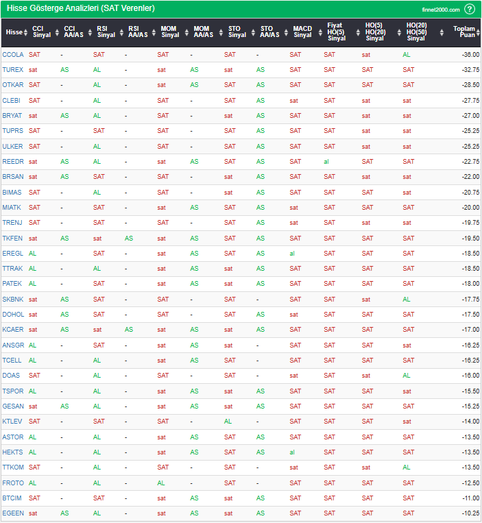 Bu çalışmada “SAT” sinyali veren hisselerin tespiti amacıyla Borsa’da işlem gören BIST 100 hisseler değerlendirmeye alınmıştır. BIST 100 üzerinde teknik analizde kullanılan 12 gösterge yöntemi ile değerleme yapılarak puanlamaya gidilerek hisseler sıralanmıştır. Ancak hisse seçiminde teknik göstergelerin tek başına kullanılması yeterli değildir. Burada ön plana çıkan hisselerin temel analizle desteklemesi ve hisseyle ilgili son haber ve bilgilerin de değerlendirilerek işlemde bulunması, daha sağlıklı sonuçlar için yararlı olacaktır.