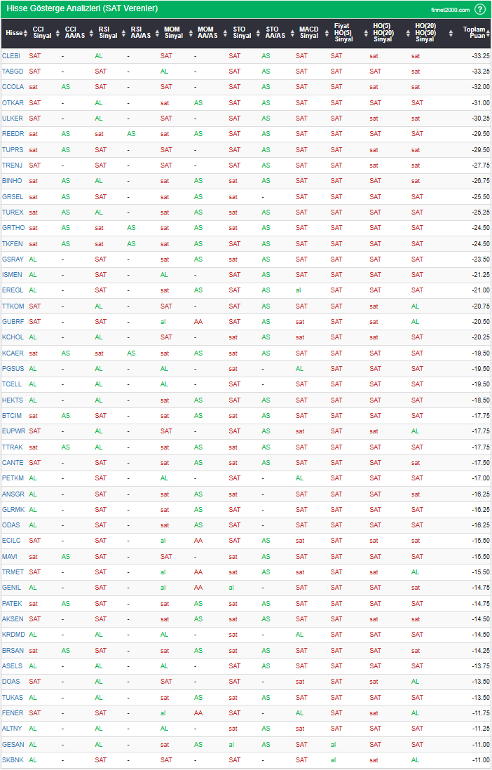 Bu çalışmada “SAT” sinyali veren hisselerin tespiti amacıyla Borsa’da işlem gören BIST 100 hisseler değerlendirmeye alınmıştır. BIST 100 üzerinde teknik analizde kullanılan 12 gösterge yöntemi ile değerleme yapılarak puanlamaya gidilerek hisseler sıralanmıştır. Ancak hisse seçiminde teknik göstergelerin tek başına kullanılması yeterli değildir. Burada ön plana çıkan hisselerin temel analizle desteklemesi ve hisseyle ilgili son haber ve bilgilerin de değerlendirilerek işlemde bulunması, daha sağlıklı sonuçlar için yararlı olacaktır.