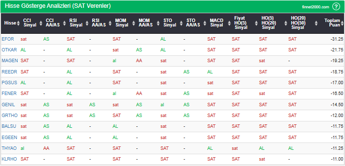 Bu çalışmada “SAT” sinyali veren hisselerin tespiti amacıyla Borsa’da işlem gören BIST 100 hisseler değerlendirmeye alınmıştır. BIST 100 üzerinde teknik analizde kullanılan 12 gösterge yöntemi ile değerleme yapılarak puanlamaya gidilerek hisseler sıralanmıştır. Ancak hisse seçiminde teknik göstergelerin tek başına kullanılması yeterli değildir. Burada ön plana çıkan hisselerin temel analizle desteklemesi ve hisseyle ilgili son haber ve bilgilerin de değerlendirilerek işlemde bulunması, daha sağlıklı sonuçlar için yararlı olacaktır.