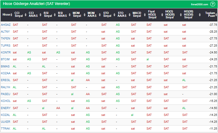 Bu çalışmada “SAT” sinyali veren hisselerin tespiti amacıyla Borsa’da işlem gören BIST 100 hisseler değerlendirmeye alınmıştır. BIST 100 üzerinde teknik analizde kullanılan 12 gösterge yöntemi ile değerleme yapılarak puanlamaya gidilerek hisseler sıralanmıştır. Ancak hisse seçiminde teknik göstergelerin tek başına kullanılması yeterli değildir. Burada ön plana çıkan hisselerin temel analizle desteklemesi ve hisseyle ilgili son haber ve bilgilerin de değerlendirilerek işlemde bulunması, daha sağlıklı sonuçlar için yararlı olacaktır.