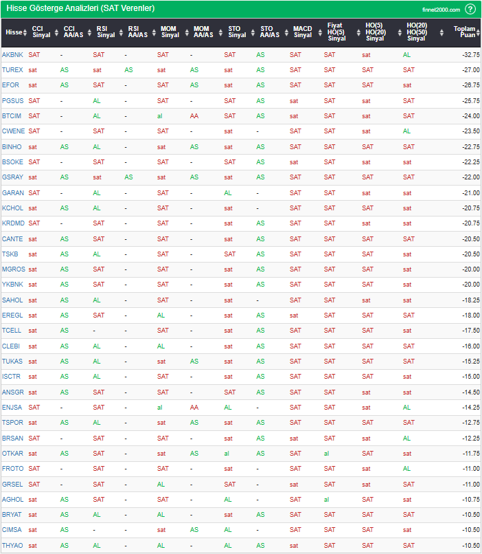 Bu çalışmada “SAT” sinyali veren hisselerin tespiti amacıyla Borsa’da işlem gören BIST 100 hisseler değerlendirmeye alınmıştır. BIST 100 üzerinde teknik analizde kullanılan 12 gösterge yöntemi ile değerleme yapılarak puanlamaya gidilerek hisseler sıralanmıştır. Ancak hisse seçiminde teknik göstergelerin tek başına kullanılması yeterli değildir. Burada ön plana çıkan hisselerin temel analizle desteklemesi ve hisseyle ilgili son haber ve bilgilerin de değerlendirilerek işlemde bulunması, daha sağlıklı sonuçlar için yararlı olacaktır.