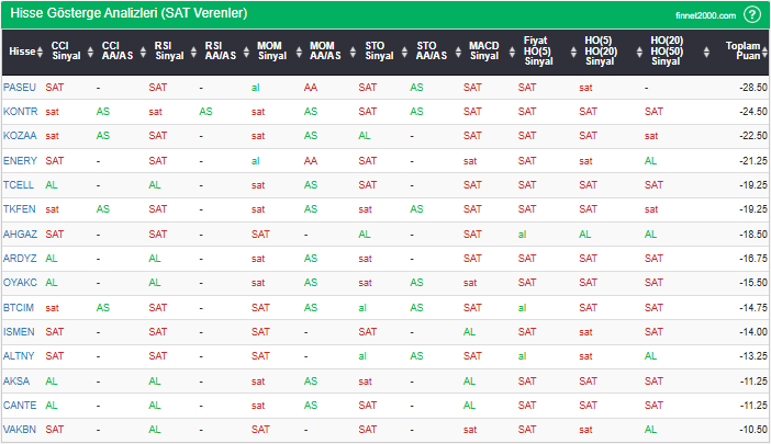 Bu çalışmada “SAT” sinyali veren hisselerin tespiti amacıyla Borsa’da işlem gören BIST 100 hisseler değerlendirmeye alınmıştır. BIST 100 üzerinde teknik analizde kullanılan 12 gösterge yöntemi ile değerleme yapılarak puanlamaya gidilerek hisseler sıralanmıştır. Ancak hisse seçiminde teknik göstergelerin tek başına kullanılması yeterli değildir. Burada ön plana çıkan hisselerin temel analizle desteklemesi ve hisseyle ilgili son haber ve bilgilerin de değerlendirilerek işlemde bulunması, daha sağlıklı sonuçlar için yararlı olacaktır.