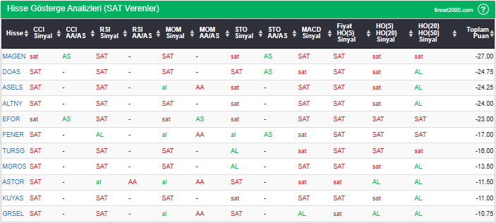 Bu çalışmada “SAT” sinyali veren hisselerin tespiti amacıyla Borsa’da işlem gören BIST 100 hisseler değerlendirmeye alınmıştır. BIST 100 üzerinde teknik analizde kullanılan 12 gösterge yöntemi ile değerleme yapılarak puanlamaya gidilerek hisseler sıralanmıştır. Ancak hisse seçiminde teknik göstergelerin tek başına kullanılması yeterli değildir. Burada ön plana çıkan hisselerin temel analizle desteklemesi ve hisseyle ilgili son haber ve bilgilerin de değerlendirilerek işlemde bulunması, daha sağlıklı sonuçlar için yararlı olacaktır.