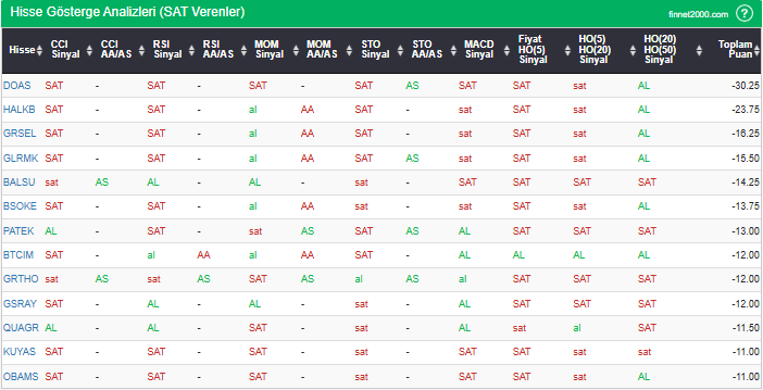 Bu çalışmada “SAT” sinyali veren hisselerin tespiti amacıyla Borsa’da işlem gören BIST 100 hisseler değerlendirmeye alınmıştır. BIST 100 üzerinde teknik analizde kullanılan 12 gösterge yöntemi ile değerleme yapılarak puanlamaya gidilerek hisseler sıralanmıştır. Ancak hisse seçiminde teknik göstergelerin tek başına kullanılması yeterli değildir. Burada ön plana çıkan hisselerin temel analizle desteklemesi ve hisseyle ilgili son haber ve bilgilerin de değerlendirilerek işlemde bulunması, daha sağlıklı sonuçlar için yararlı olacaktır.