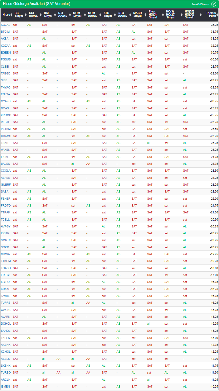 Bu çalışmada “SAT” sinyali veren hisselerin tespiti amacıyla Borsa’da işlem gören BIST 100 hisseler değerlendirmeye alınmıştır. BIST 100 üzerinde teknik analizde kullanılan 12 gösterge yöntemi ile değerleme yapılarak puanlamaya gidilerek hisseler sıralanmıştır. Ancak hisse seçiminde teknik göstergelerin tek başına kullanılması yeterli değildir. Burada ön plana çıkan hisselerin temel analizle desteklemesi ve hisseyle ilgili son haber ve bilgilerin de değerlendirilerek işlemde bulunması, daha sağlıklı sonuçlar için yararlı olacaktır.