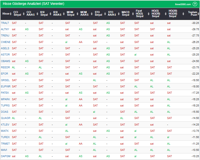 Bu çalışmada “SAT” sinyali veren hisselerin tespiti amacıyla Borsa’da işlem gören BIST 100 hisseler değerlendirmeye alınmıştır. BIST 100 üzerinde teknik analizde kullanılan 12 gösterge yöntemi ile değerleme yapılarak puanlamaya gidilerek hisseler sıralanmıştır. Ancak hisse seçiminde teknik göstergelerin tek başına kullanılması yeterli değildir. Burada ön plana çıkan hisselerin temel analizle desteklemesi ve hisseyle ilgili son haber ve bilgilerin de değerlendirilerek işlemde bulunması, daha sağlıklı sonuçlar için yararlı olacaktır.