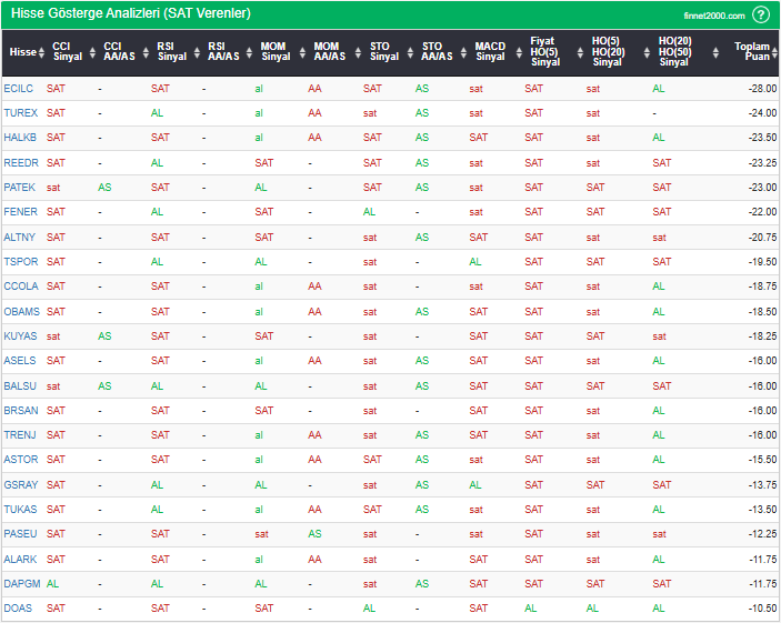 Bu çalışmada “SAT” sinyali veren hisselerin tespiti amacıyla Borsa’da işlem gören BIST 100 hisseler değerlendirmeye alınmıştır. BIST 100 üzerinde teknik analizde kullanılan 12 gösterge yöntemi ile değerleme yapılarak puanlamaya gidilerek hisseler sıralanmıştır. Ancak hisse seçiminde teknik göstergelerin tek başına kullanılması yeterli değildir. Burada ön plana çıkan hisselerin temel analizle desteklemesi ve hisseyle ilgili son haber ve bilgilerin de değerlendirilerek işlemde bulunması, daha sağlıklı sonuçlar için yararlı olacaktır.