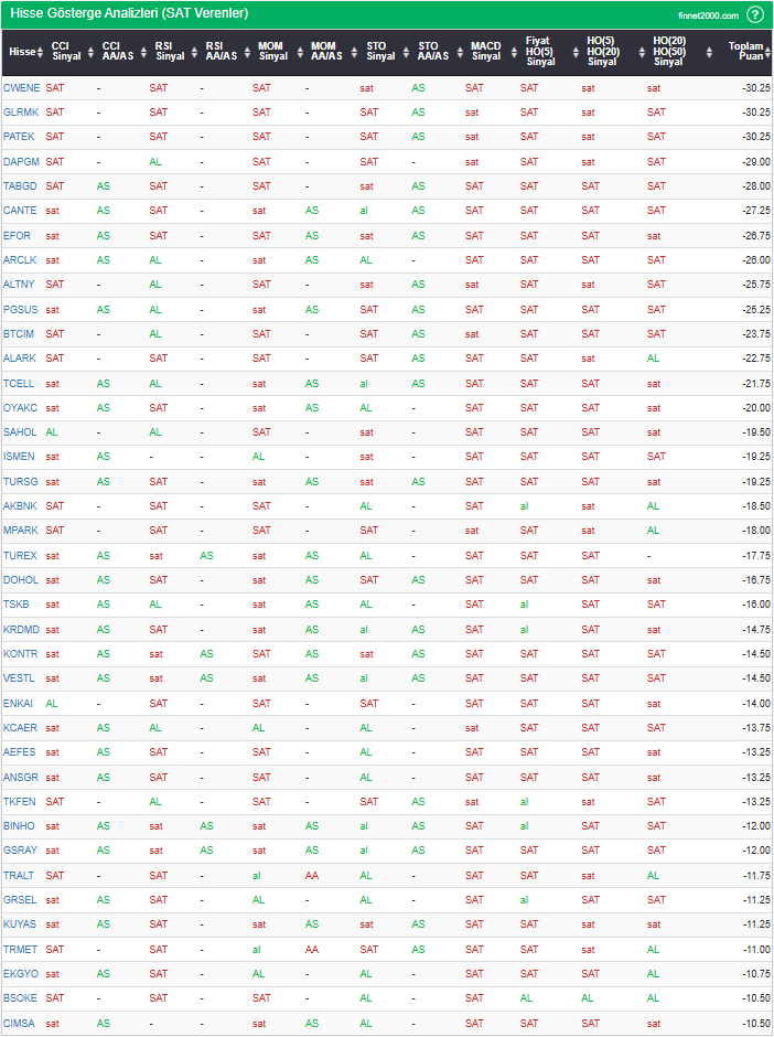 Bu çalışmada “SAT” sinyali veren hisselerin tespiti amacıyla Borsa’da işlem gören BIST 100 hisseler değerlendirmeye alınmıştır. BIST 100 üzerinde teknik analizde kullanılan 12 gösterge yöntemi ile değerleme yapılarak puanlamaya gidilerek hisseler sıralanmıştır. Ancak hisse seçiminde teknik göstergelerin tek başına kullanılması yeterli değildir. Burada ön plana çıkan hisselerin temel analizle desteklemesi ve hisseyle ilgili son haber ve bilgilerin de değerlendirilerek işlemde bulunması, daha sağlıklı sonuçlar için yararlı olacaktır.