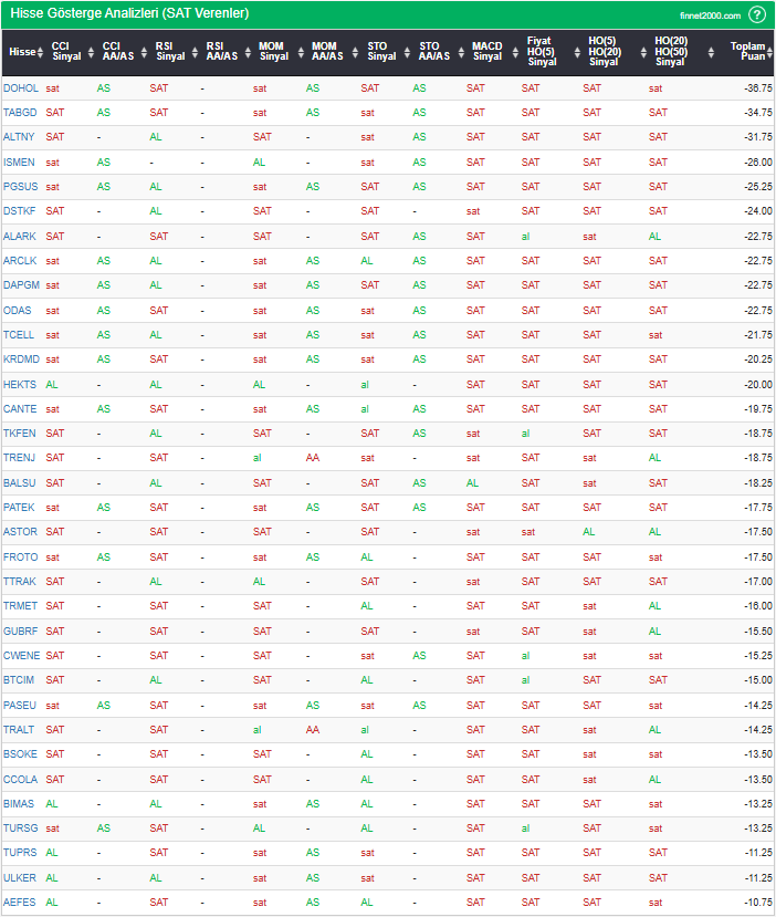 Bu çalışmada “SAT” sinyali veren hisselerin tespiti amacıyla Borsa’da işlem gören BIST 100 hisseler değerlendirmeye alınmıştır. BIST 100 üzerinde teknik analizde kullanılan 12 gösterge yöntemi ile değerleme yapılarak puanlamaya gidilerek hisseler sıralanmıştır. Ancak hisse seçiminde teknik göstergelerin tek başına kullanılması yeterli değildir. Burada ön plana çıkan hisselerin temel analizle desteklemesi ve hisseyle ilgili son haber ve bilgilerin de değerlendirilerek işlemde bulunması, daha sağlıklı sonuçlar için yararlı olacaktır.