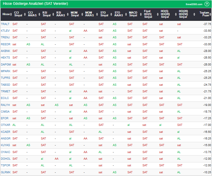Bu çalışmada “SAT” sinyali veren hisselerin tespiti amacıyla Borsa’da işlem gören BIST 100 hisseler değerlendirmeye alınmıştır. BIST 100 üzerinde teknik analizde kullanılan 12 gösterge yöntemi ile değerleme yapılarak puanlamaya gidilerek hisseler sıralanmıştır. Ancak hisse seçiminde teknik göstergelerin tek başına kullanılması yeterli değildir. Burada ön plana çıkan hisselerin temel analizle desteklemesi ve hisseyle ilgili son haber ve bilgilerin de değerlendirilerek işlemde bulunması, daha sağlıklı sonuçlar için yararlı olacaktır.