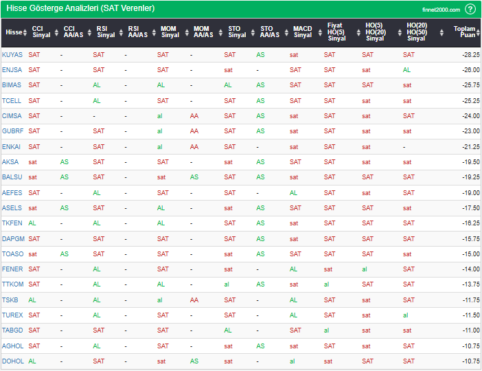 Bu çalışmada “SAT” sinyali veren hisselerin tespiti amacıyla Borsa’da işlem gören BIST 100 hisseler değerlendirmeye alınmıştır. BIST 100 üzerinde teknik analizde kullanılan 12 gösterge yöntemi ile değerleme yapılarak puanlamaya gidilerek hisseler sıralanmıştır. Ancak hisse seçiminde teknik göstergelerin tek başına kullanılması yeterli değildir. Burada ön plana çıkan hisselerin temel analizle desteklemesi ve hisseyle ilgili son haber ve bilgilerin de değerlendirilerek işlemde bulunması, daha sağlıklı sonuçlar için yararlı olacaktır.