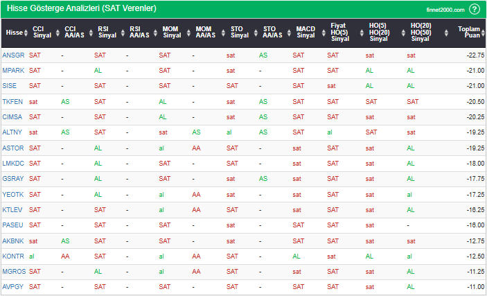Bu çalışmada “SAT” sinyali veren hisselerin tespiti amacıyla Borsa’da işlem gören BIST 100 hisseler değerlendirmeye alınmıştır. BIST 100 üzerinde teknik analizde kullanılan 12 gösterge yöntemi ile değerleme yapılarak puanlamaya gidilerek hisseler sıralanmıştır. Ancak hisse seçiminde teknik göstergelerin tek başına kullanılması yeterli değildir. Burada ön plana çıkan hisselerin temel analizle desteklemesi ve hisseyle ilgili son haber ve bilgilerin de değerlendirilerek işlemde bulunması, daha sağlıklı sonuçlar için yararlı olacaktır.