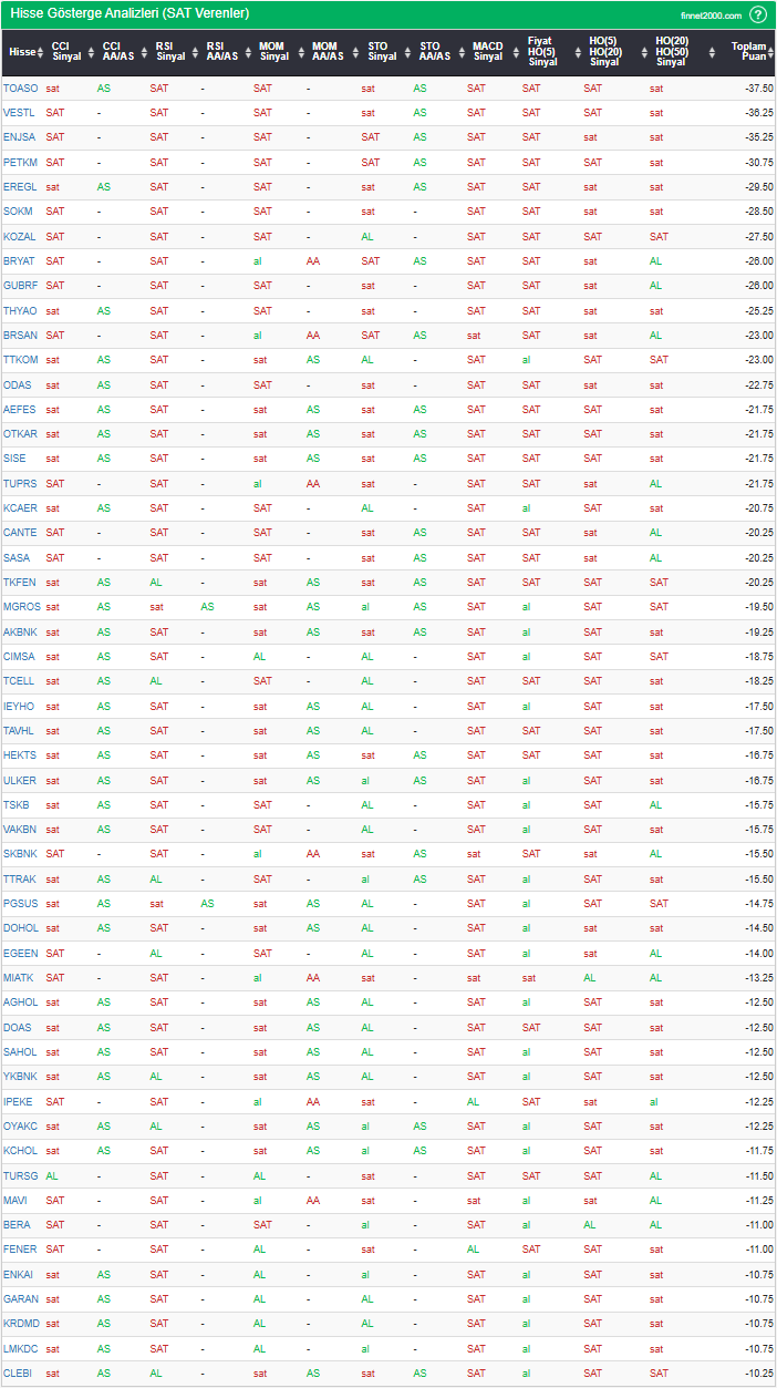 Bu çalışmada “SAT” sinyali veren hisselerin tespiti amacıyla Borsa’da işlem gören BIST 100 hisseler değerlendirmeye alınmıştır. BIST 100 üzerinde teknik analizde kullanılan 12 gösterge yöntemi ile değerleme yapılarak puanlamaya gidilerek hisseler sıralanmıştır. Ancak hisse seçiminde teknik göstergelerin tek başına kullanılması yeterli değildir. Burada ön plana çıkan hisselerin temel analizle desteklemesi ve hisseyle ilgili son haber ve bilgilerin de değerlendirilerek işlemde bulunması, daha sağlıklı sonuçlar için yararlı olacaktır.