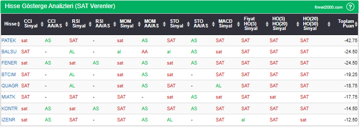 Bu çalışmada “SAT” sinyali veren hisselerin tespiti amacıyla Borsa’da işlem gören BIST 100 hisseler değerlendirmeye alınmıştır. BIST 100 üzerinde teknik analizde kullanılan 12 gösterge yöntemi ile değerleme yapılarak puanlamaya gidilerek hisseler sıralanmıştır. Ancak hisse seçiminde teknik göstergelerin tek başına kullanılması yeterli değildir. Burada ön plana çıkan hisselerin temel analizle desteklemesi ve hisseyle ilgili son haber ve bilgilerin de değerlendirilerek işlemde bulunması, daha sağlıklı sonuçlar için yararlı olacaktır.