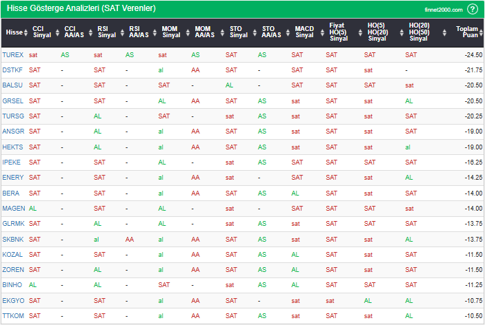 Bu çalışmada “SAT” sinyali veren hisselerin tespiti amacıyla Borsa’da işlem gören BIST 100 hisseler değerlendirmeye alınmıştır. BIST 100 üzerinde teknik analizde kullanılan 12 gösterge yöntemi ile değerleme yapılarak puanlamaya gidilerek hisseler sıralanmıştır. Ancak hisse seçiminde teknik göstergelerin tek başına kullanılması yeterli değildir. Burada ön plana çıkan hisselerin temel analizle desteklemesi ve hisseyle ilgili son haber ve bilgilerin de değerlendirilerek işlemde bulunması, daha sağlıklı sonuçlar için yararlı olacaktır.